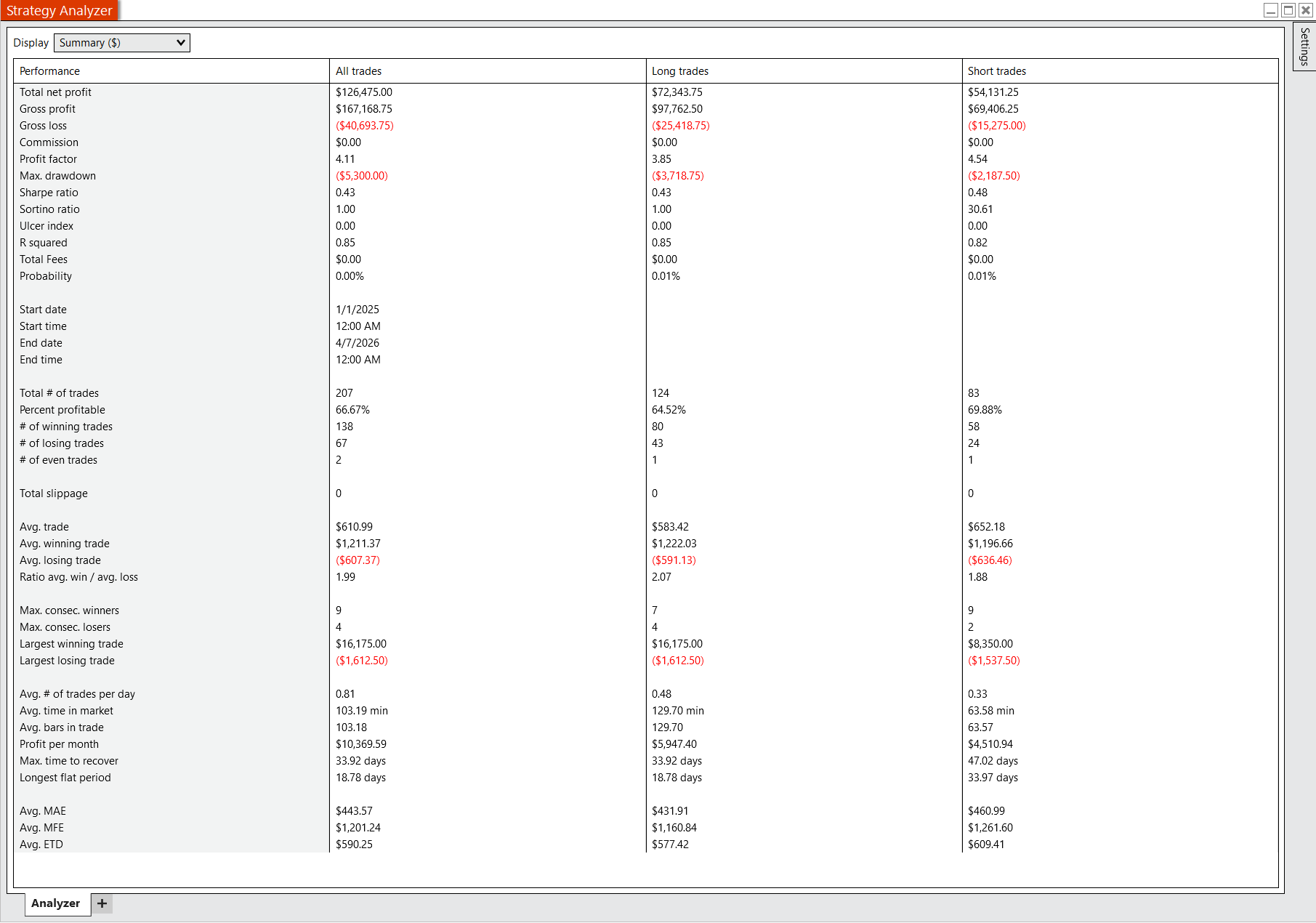 These results are hypothetical and based on a historical simulation using a predefined default configuration. That default configuration may include not only opening range breakout trades, but also reversal and fade-style trades depending on market conditions and strategy settings. The results do not represent actual trading and are not indicative of future results. Performance will vary based on market conditions, platform behavior, user configuration, execution quality, and trader decisions. Users who want only ORB-style behavior must configure that themselves within NinjaTrader. TradeReign does not influence strategy performance and only enforces user-defined rules.