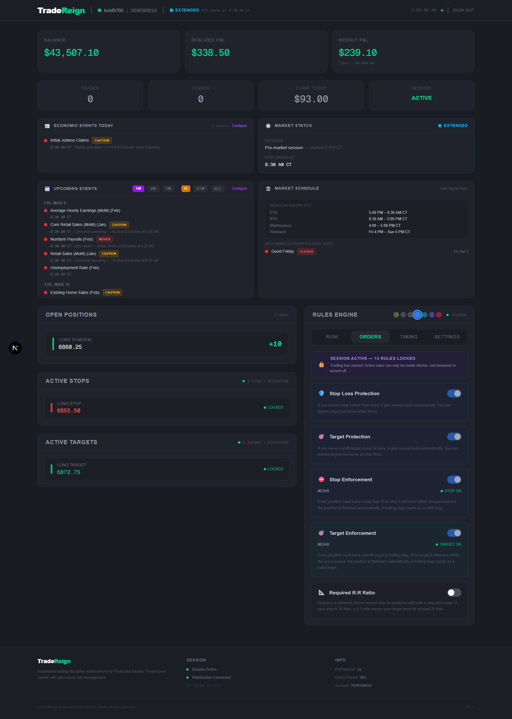 Set your trading rules once. TradeReign enforces them in real time on Tradovate β every session, no exceptions.