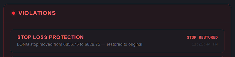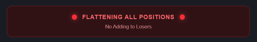 Flatten immediately if you increase position size while in a losing trade. Prevents averaging down.